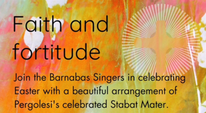 Be moved and inspired by the famous and beautiful Baroque music of Giovanni Battista Pergolesi, and consider the sorrowful but momentus events of Easter through the eyes of Christ's mother Mary. Supported by wonderful and talented Perth Musicians and Soloists, the Barnabas Singers perform a fine choral arrangement of this important work.
