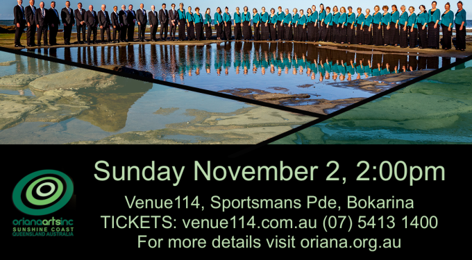 The Sunshine Coast’s acclaimed vocal ensemble, Oriana Choir, proudly announces its 20th Anniversary Gala Concert, to be held on Sunday, November 2nd at 2:00pm at Venue 114, Bokarina.